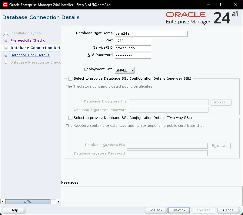 In the next step you have to provide the database information. Remember, if you created the database with the template, you may not need this, and you can involke EM Prerequisite Kit with the parameter
