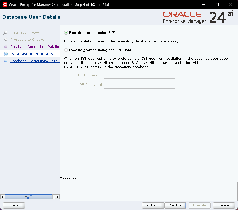 In the next steps the database is checked, therefor the user SYS is needed. Or you create an SYSMAN_ADMIN user to do the checks (see second option)